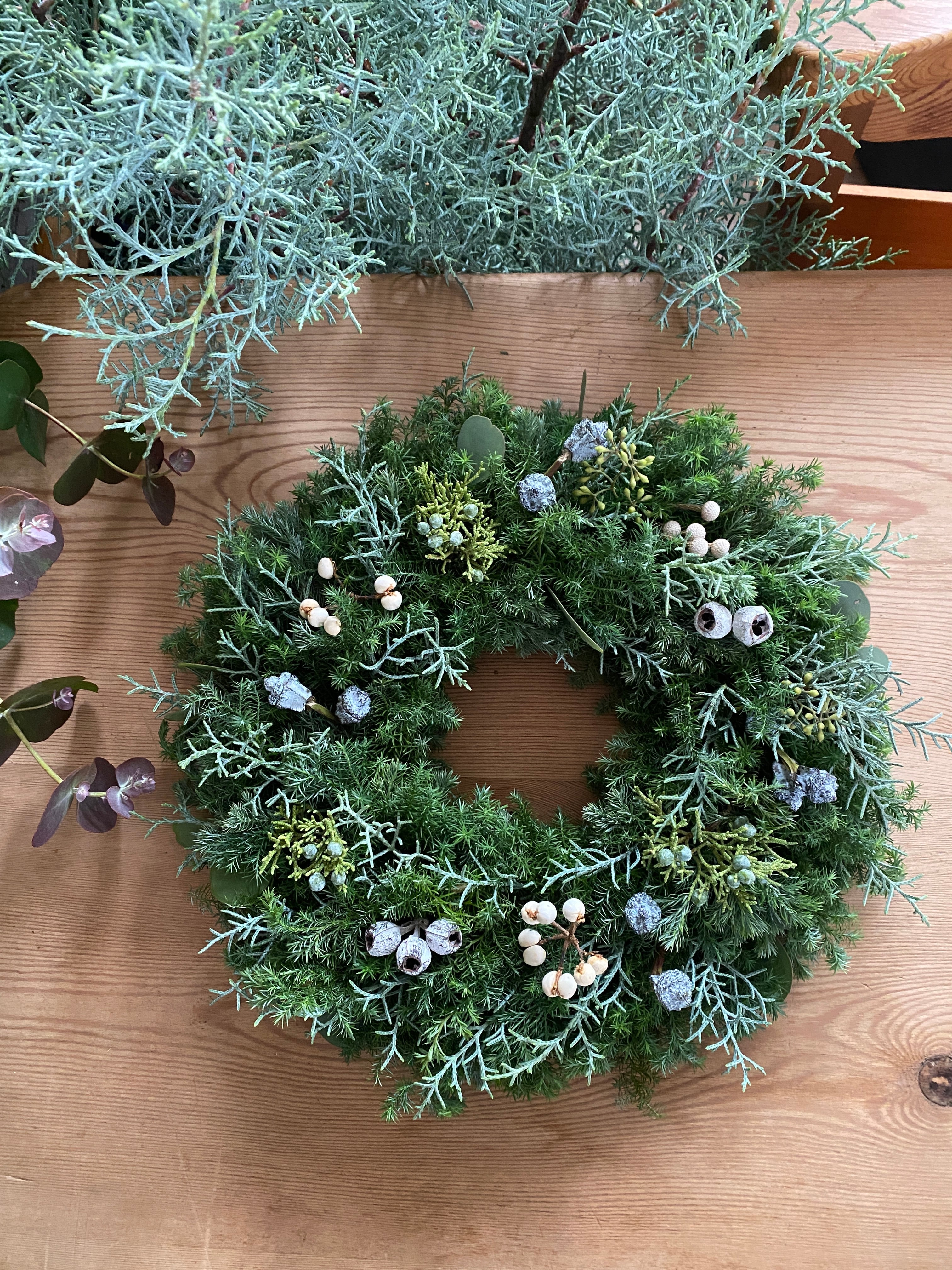 ユーカリ(グロボラス、ポポラス)、ジュニパーベリー、白い実(南京ハゼ、バーゼリア)を使ったフレッシュなグリーンリースです。